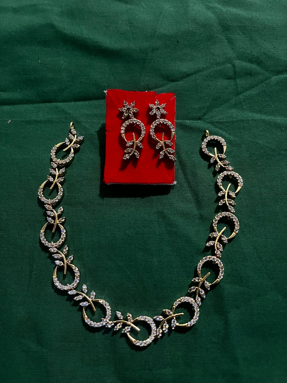 A modern and elegant necklace set featuring a chain of diamond-studded leaf motifs linked by golden rings. Comes with a matching pair of floral stud earrings. Perfect for adding a subtle sparkle to both traditional and Western outfits.