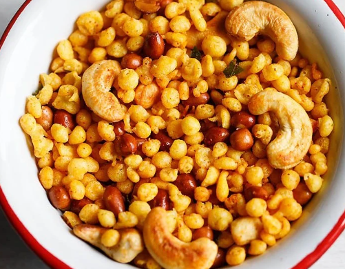 Kara Boondi is a crunchy snack made from a flowing batter of chickpea flour (Besan), which is dropped through a perforated ladle into hot oil, forming tiny, crispy pearls (Boondi). This is then seasoned with spices like chili powder, salt, and mixed with fried cashew nuts (kaju), peanuts, and aromatic curry leaves to create a rich, savory mixture.